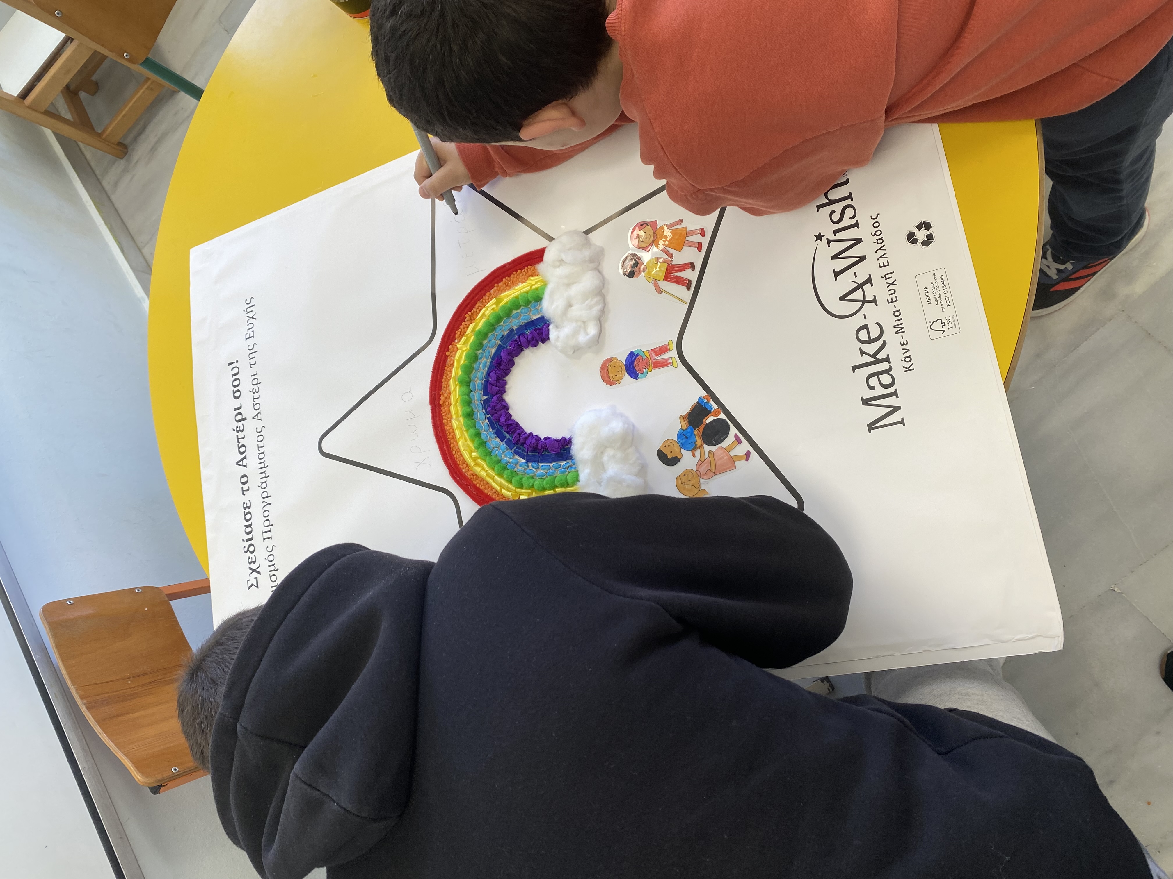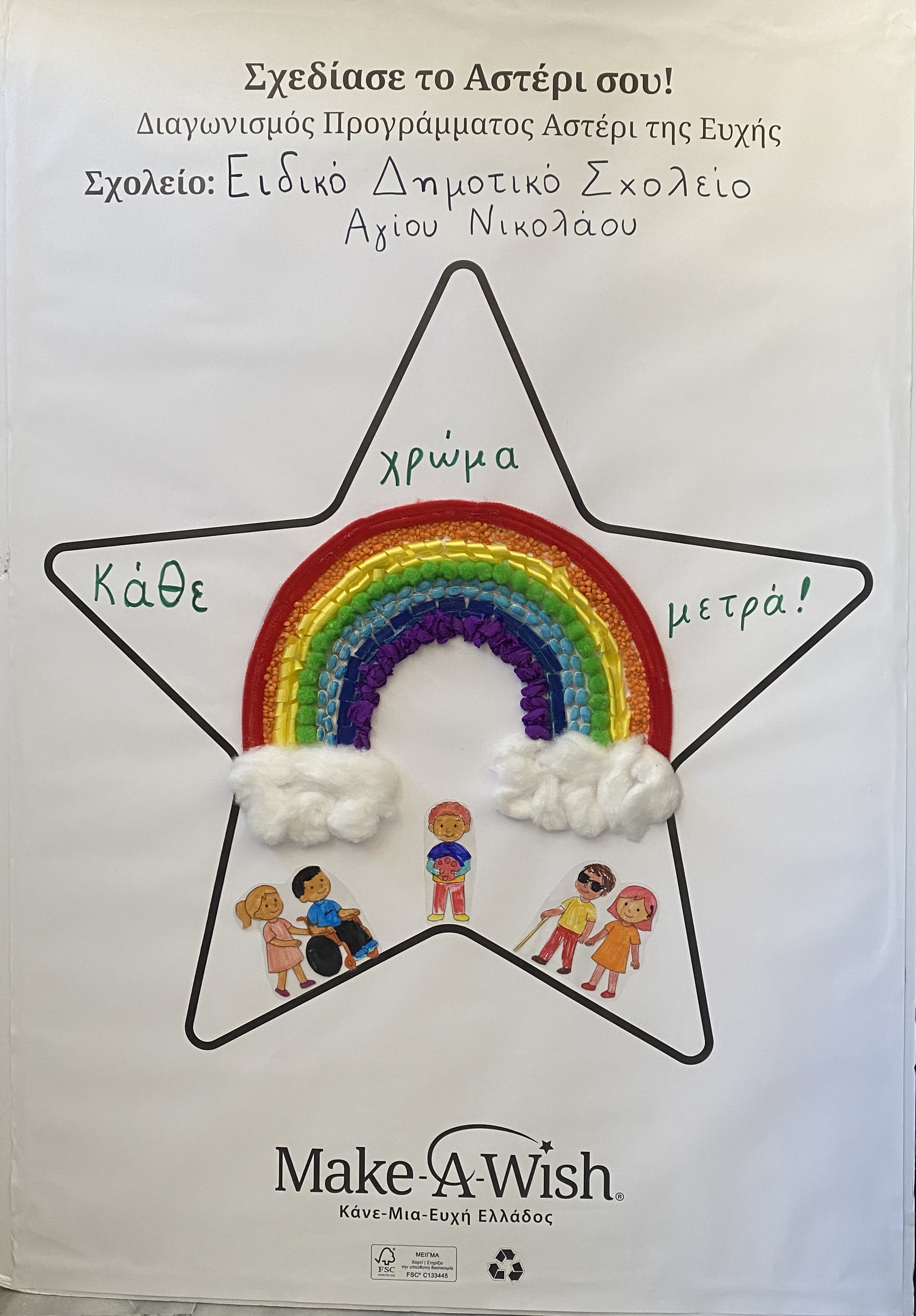 Το σχολείο μας συμμετείχε με ενθουσιασμό στον διαγωνισμό του Make-A-Wish Ελλάδος «Σχεδίασε το δικό σου αστέρι», δημιουργώντας ένα έργο γεμάτο χρώμα και αισιοδοξία. Το αστέρι μας κοσμείται από ένα φωτεινό ουράνιο τόξο, όπου κάθε χρώμα είναι φτιαγμένο από διαφορετικό υλικό, αναδεικνύοντας τη μοναδικότητα και τη διαφορετικότητα. Κάτω από αυτό, απεικονίζονται παιδιά, τονίζοντας τη σημασία της ισότητας και της συμπερίληψης. Το μήνυμα «Κάθε χρώμα μετρά!» εκφράζει με απλό αλλά ουσιαστικό τρόπο την αξία κάθε παιδιού, ανεξάρτητα από τις ιδιαιτερότητές του. Μέσα από αυτή τη δημιουργία, οι μαθητές μας έστειλαν ένα δυνατό μήνυμα αγάπης, αποδοχής και ενότητας, συμβάλλοντας με τον δικό τους τρόπο στον σημαντικό σκοπό του οργανισμού.